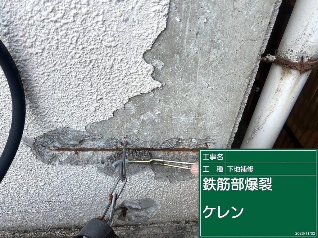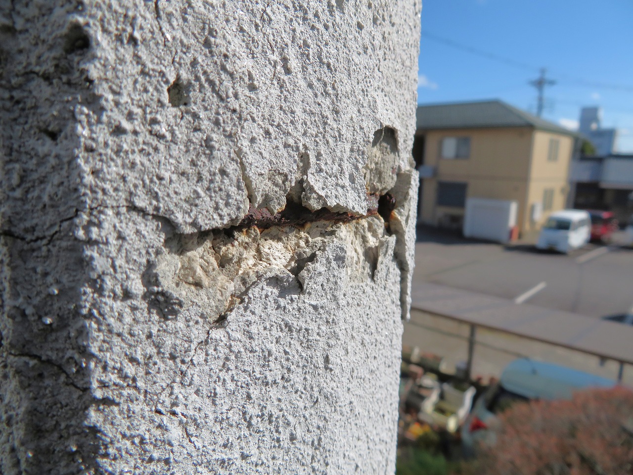 水分の侵入などによって内部の鉄筋が錆びつくと、徐々に膨張して周囲を押し上げていきます。やがて、内部からの圧力に耐えられなくなった外側のモルタル等がひび割れ、破裂したように砕けて欠損を起こします。