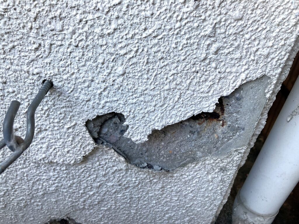 爆裂現象が起きた外壁。表面が剥がれ落ちて、鉄筋が一部露出している状態です。