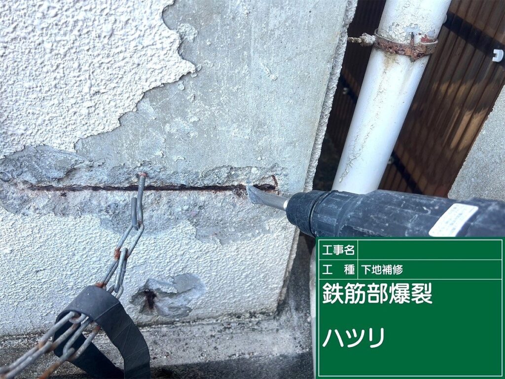 周辺の脆くなった部分や浮いた部分を斫ってそぎ落とします。