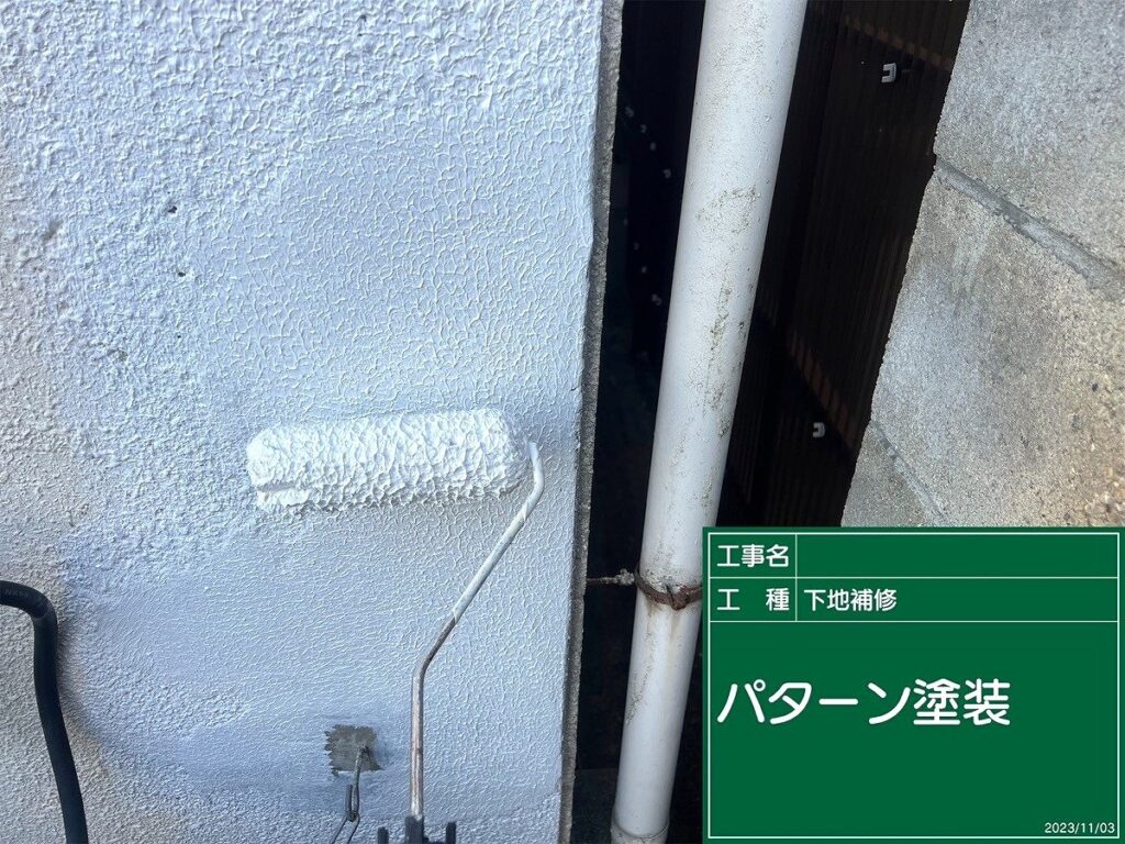 既存の外壁に合わせて塗装を行います。場合によっては「パターン付け」という、補修跡が目立たないようにわざと凹凸を付けて馴染ませる作業も。