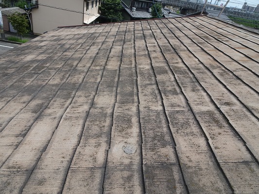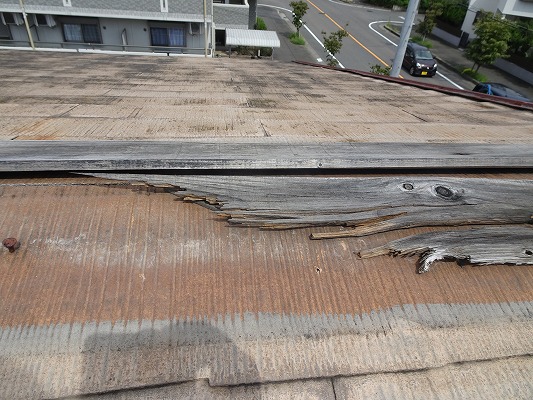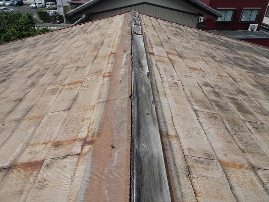 築年数は50年ほどで、屋根材もかなり劣化が見られました。板金部は錆が広がり、棟の下地も腐食等が起きていました。