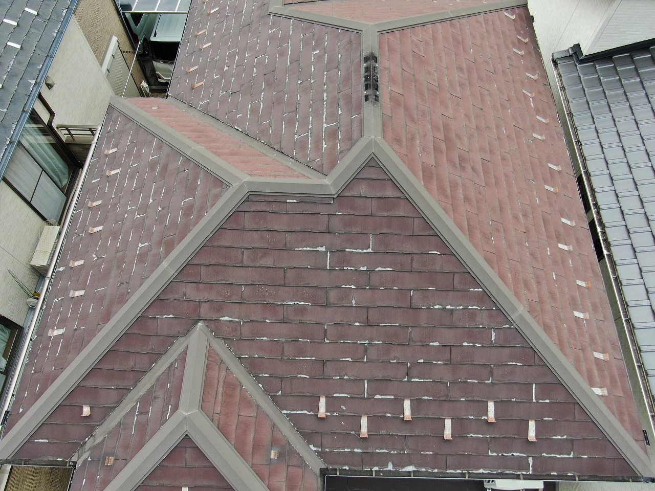 豊山町にある築15年を過ぎたお住まいです。屋根がとても傷んでいて…とのご相談でした。建物診断にお伺いすると、「パミール」という屋根材が使われていることが分かりました。屋根材が層状に剥がれていくという劣化症状が特徴で、表面に塗装を施しても剥離は止まらないため、屋根についてはカバー工法のご提案をいたしました。