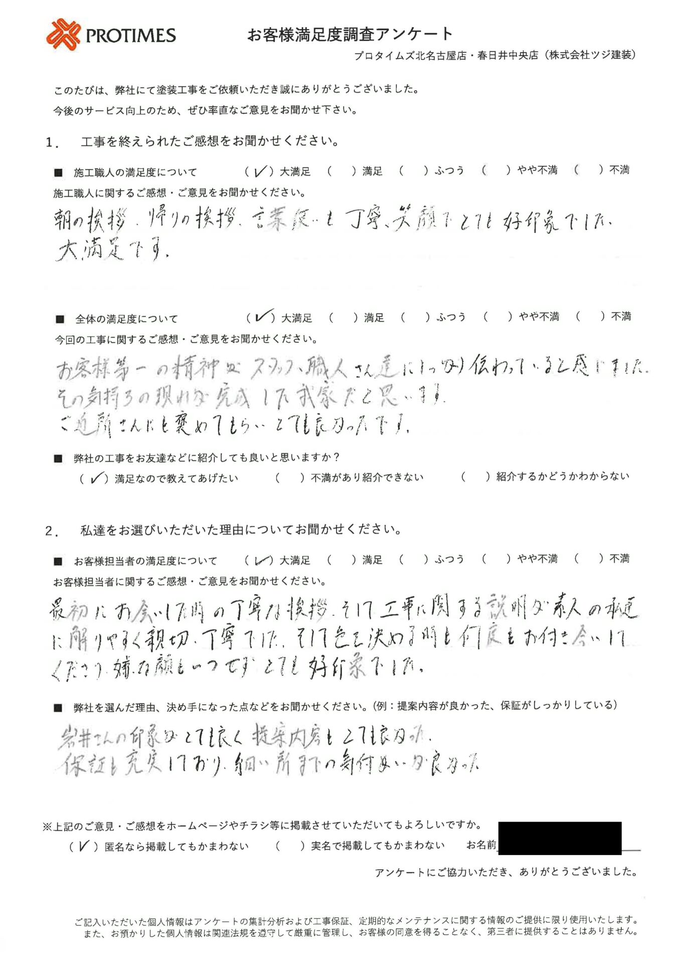 最初にお会いした時の丁寧な挨拶、そして工事に関する説明が素人の私達に解りやすく親切、丁寧でした。