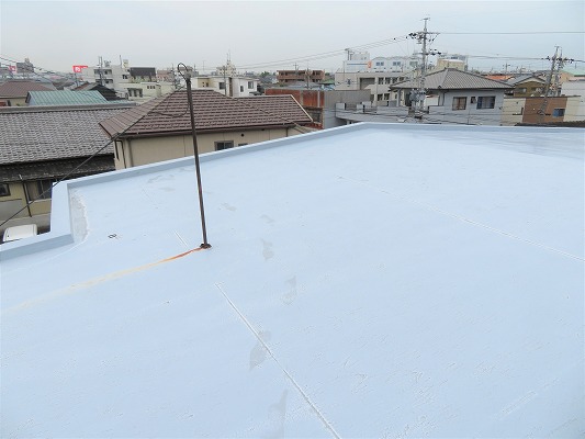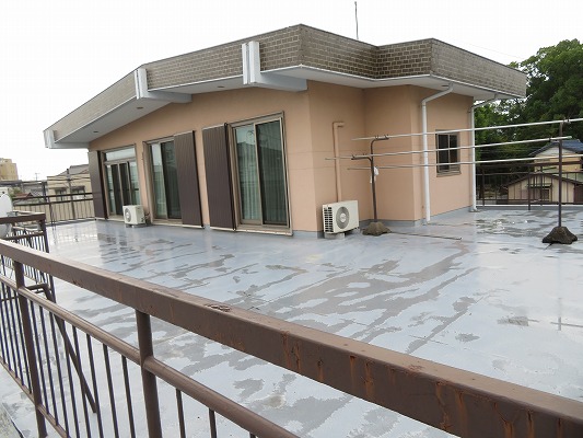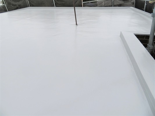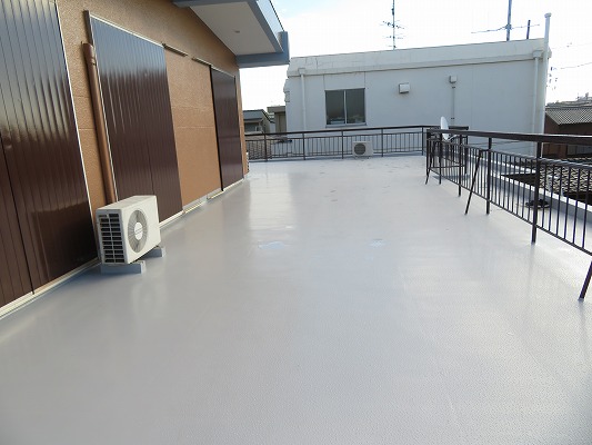 屋上やバルコニーなどの各防水部はウレタン塗膜防水の密着工法にて施工し、軒天の張替え等の補修作業も行いました。